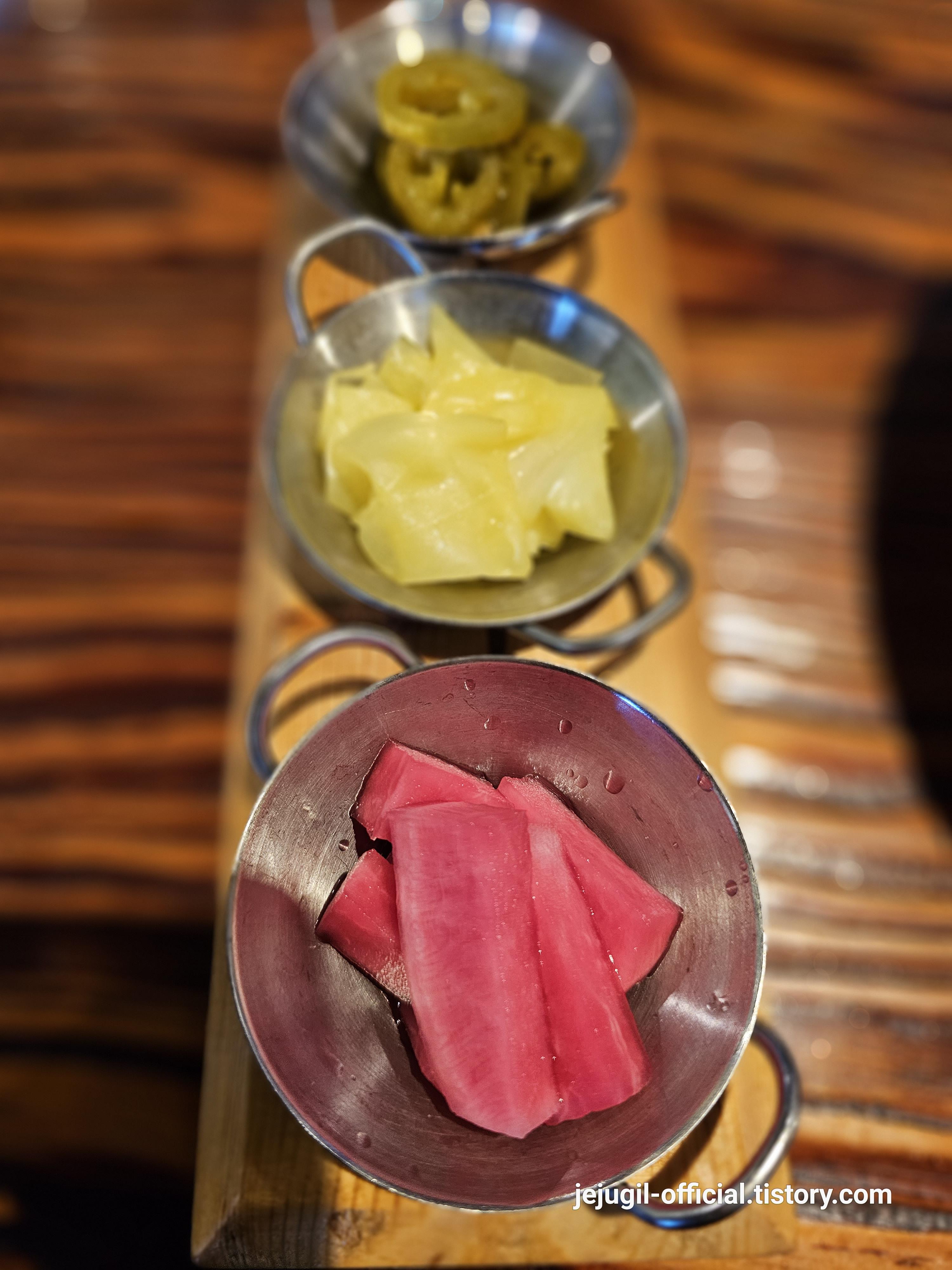 정갈하게 함께 곁들여 나오는 피클과 할라피뇨