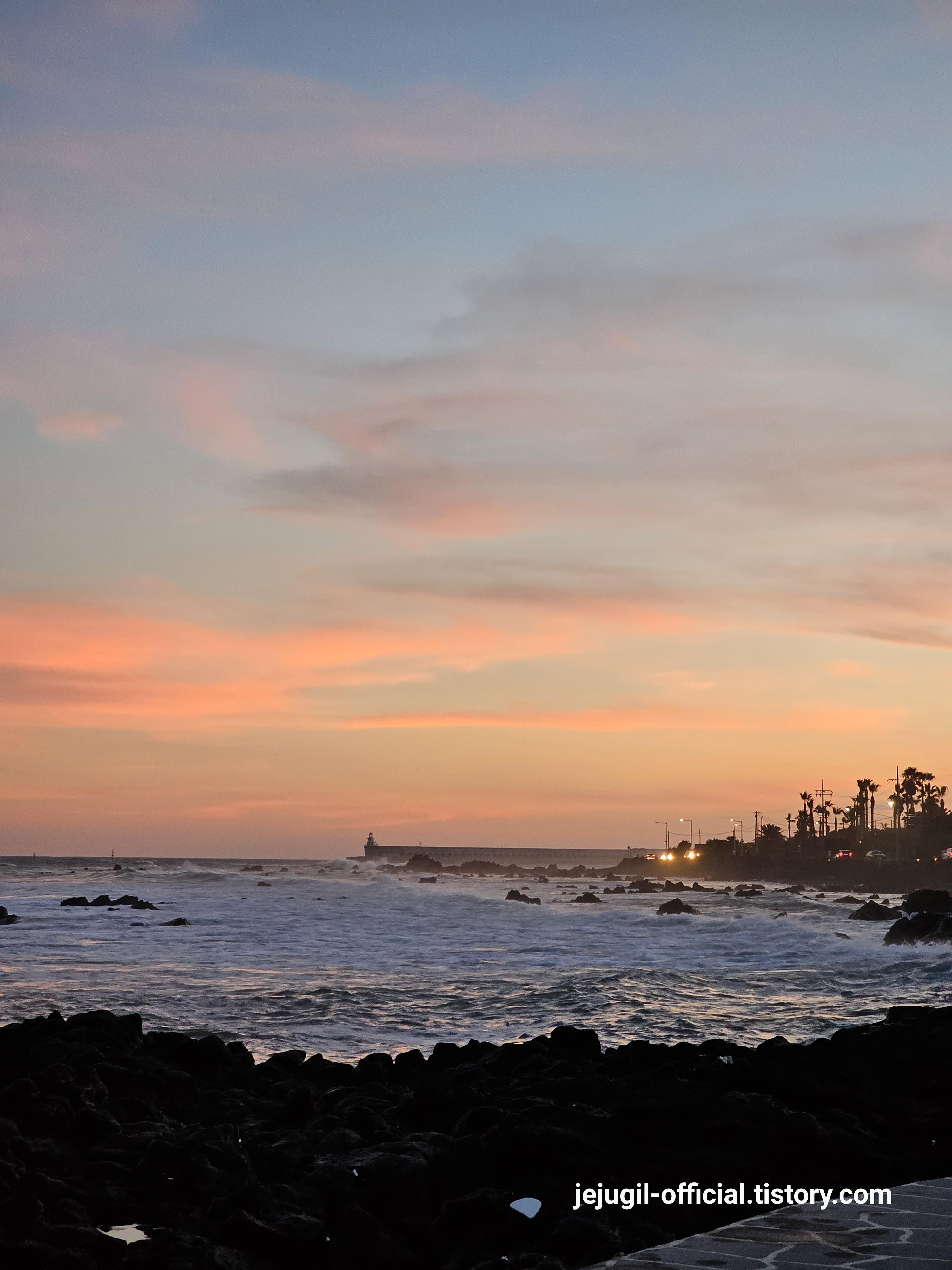 법환포구에서 보이는 강정항, 오늘 슈퍼문이 뜨는 날이라 노을이 아름답게 피어오른다.