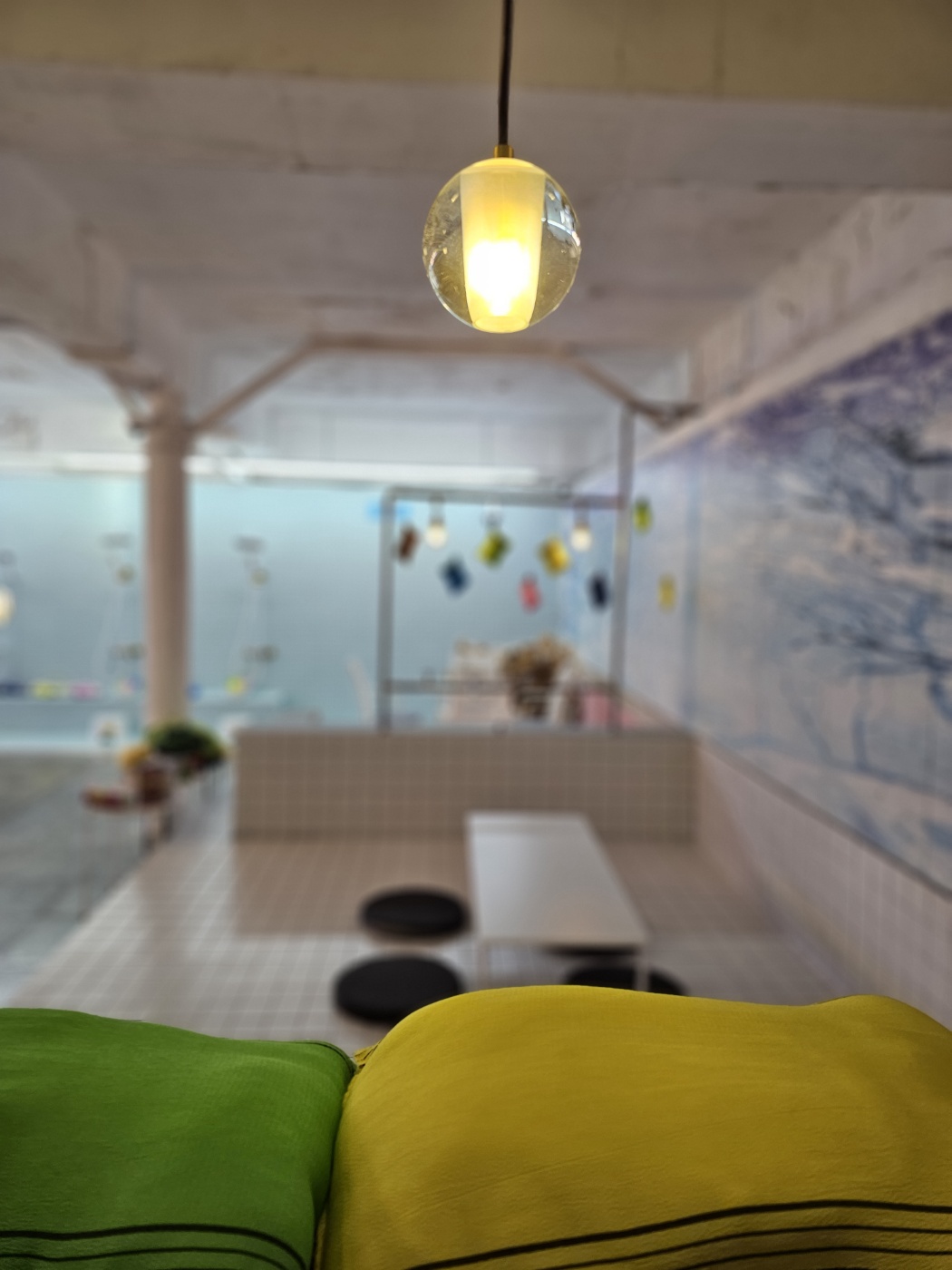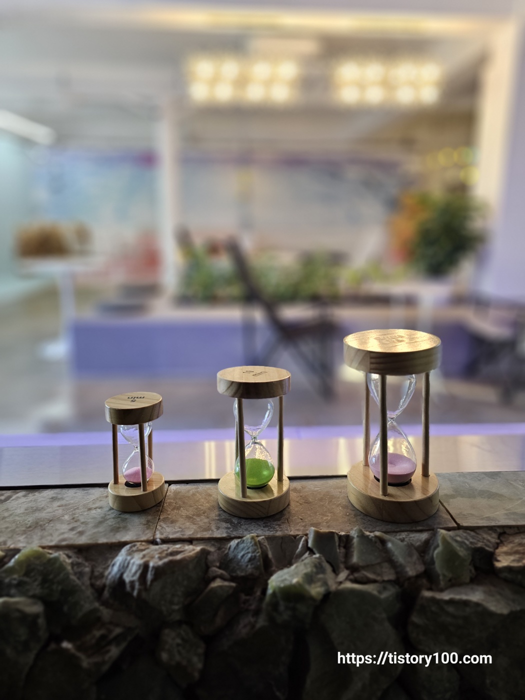 주황색 등과 이태리타올, 그리고 사우나의 필수품 모래시계까지 감성 돋는 소품들이 카페 이곳저곳에 놓여져 있어서 재미를 더해 줍니다.