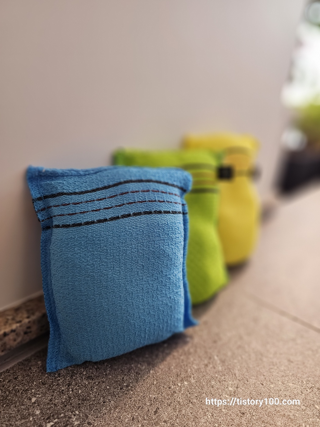 이곳에서는 왠지 발톱을 깎아야 할 듯한 느낌을 줍니다. 쿠션도 때밀이 타올이네요^^. 자꾸 피식거리며 웃게 됩니다.