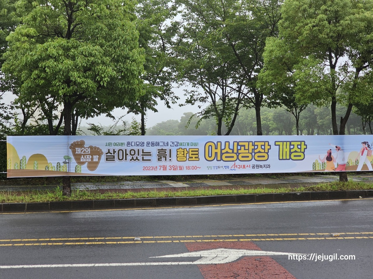 어라! 한창 공사를 하던 어싱광장! 드디어 개장 일정이 떡하니 현수막으로 걸려 있었다.
