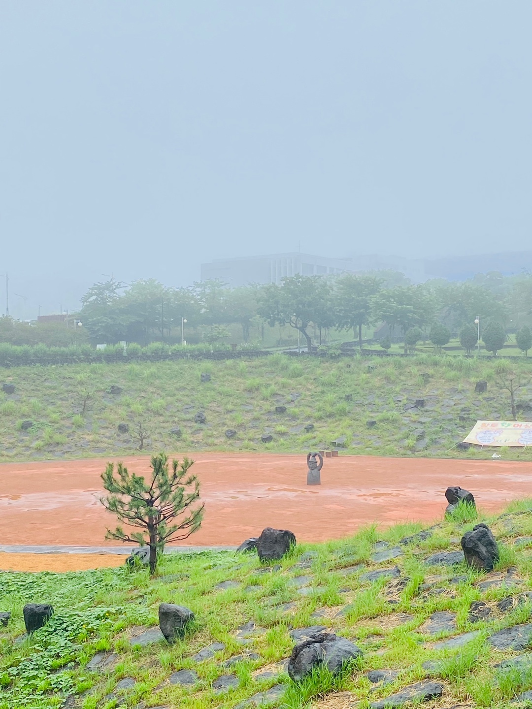 하트하루방이 개장일을 기다리며 비를 맞고 있다.