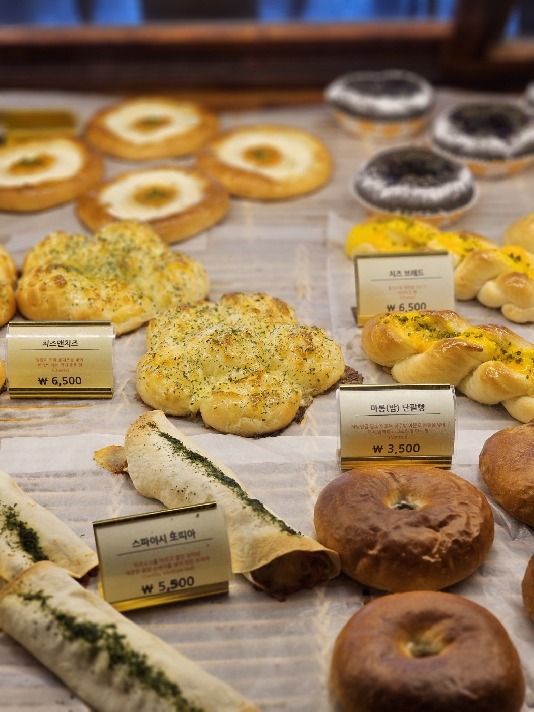 1층 건물 바깥쪽 풍경을 보기 좋도록 의자들이 놓여져 있는데 먹을 게 많이 떨어져서인지 참새들이 무서운 것도 없이 내 앞을 총총거리며 다닌다. 들어서자마자 시선을 사로잡는 빵과 디저트들