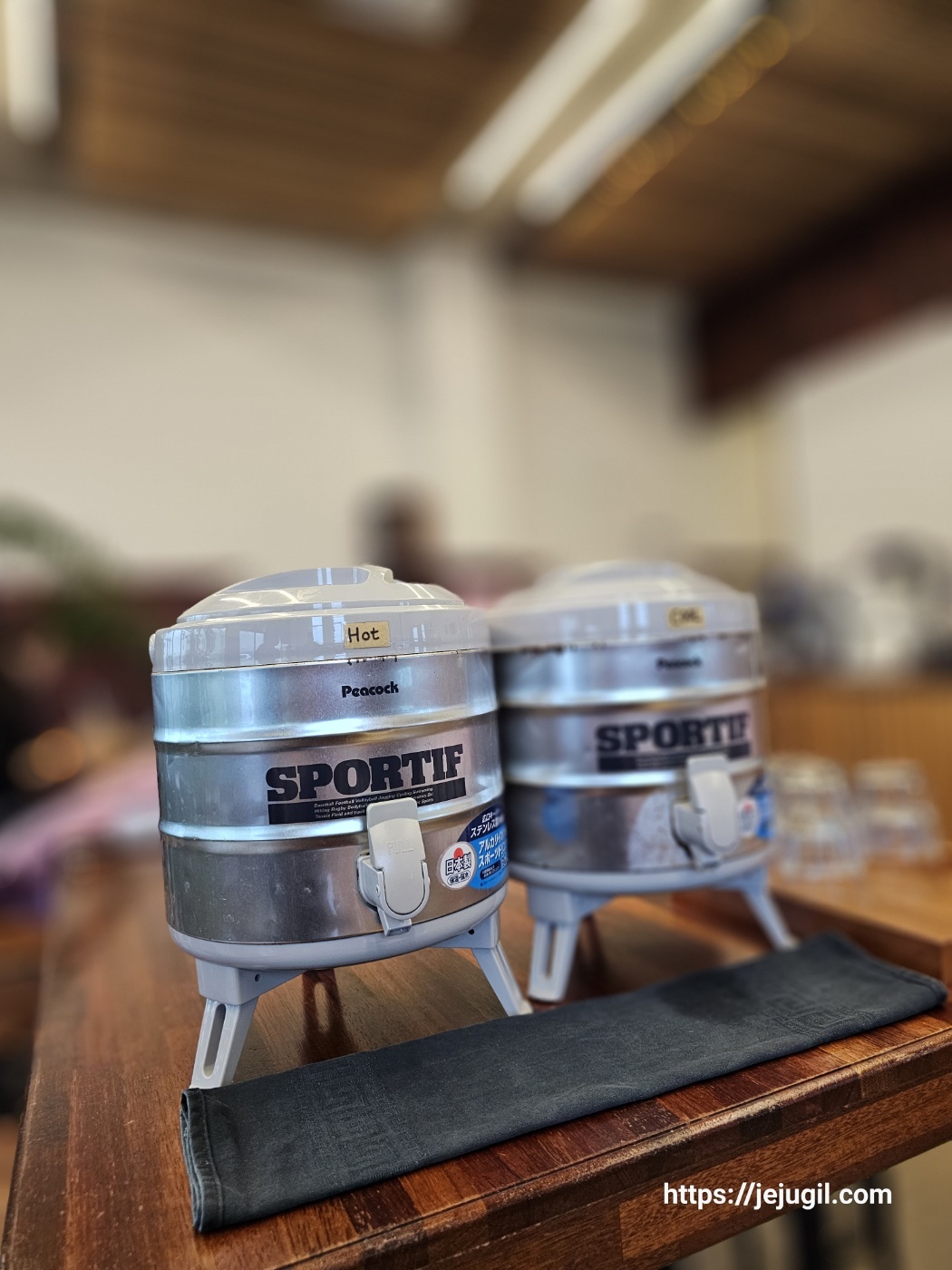 큰 테이블 끝자리에 뜨거운물통과 시원한 물통이 나란이 있어 한 컷!!!