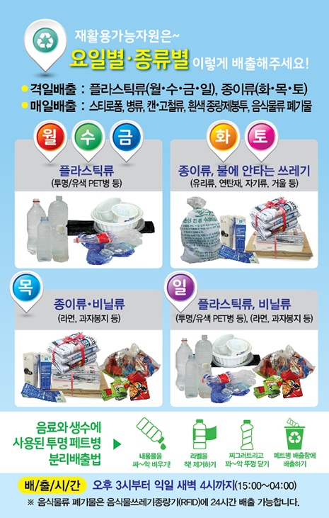 밤새 폭우가 내린 아침이다. 다행이도 보슬비만 내리길래 밀린 쓰레기를 치우러 재활용도움센터로 향했다. 제주도는 대구시와는 다르게 집 앞에 종량제 쓰레기를 내 놓을 수 없고 이렇게 도움센터나 따로 마련된 클린하우스에 배출을 해야 한다. 가까운데 곳에 클린하우스가 있지만 이곳을 이용하는 이유는 요일과 상관없이 쓰레기를 분리 배출 할 수 있어서다. 클린 하우스는 아래와 같이 요일별로 별도로 배출해야 한다.