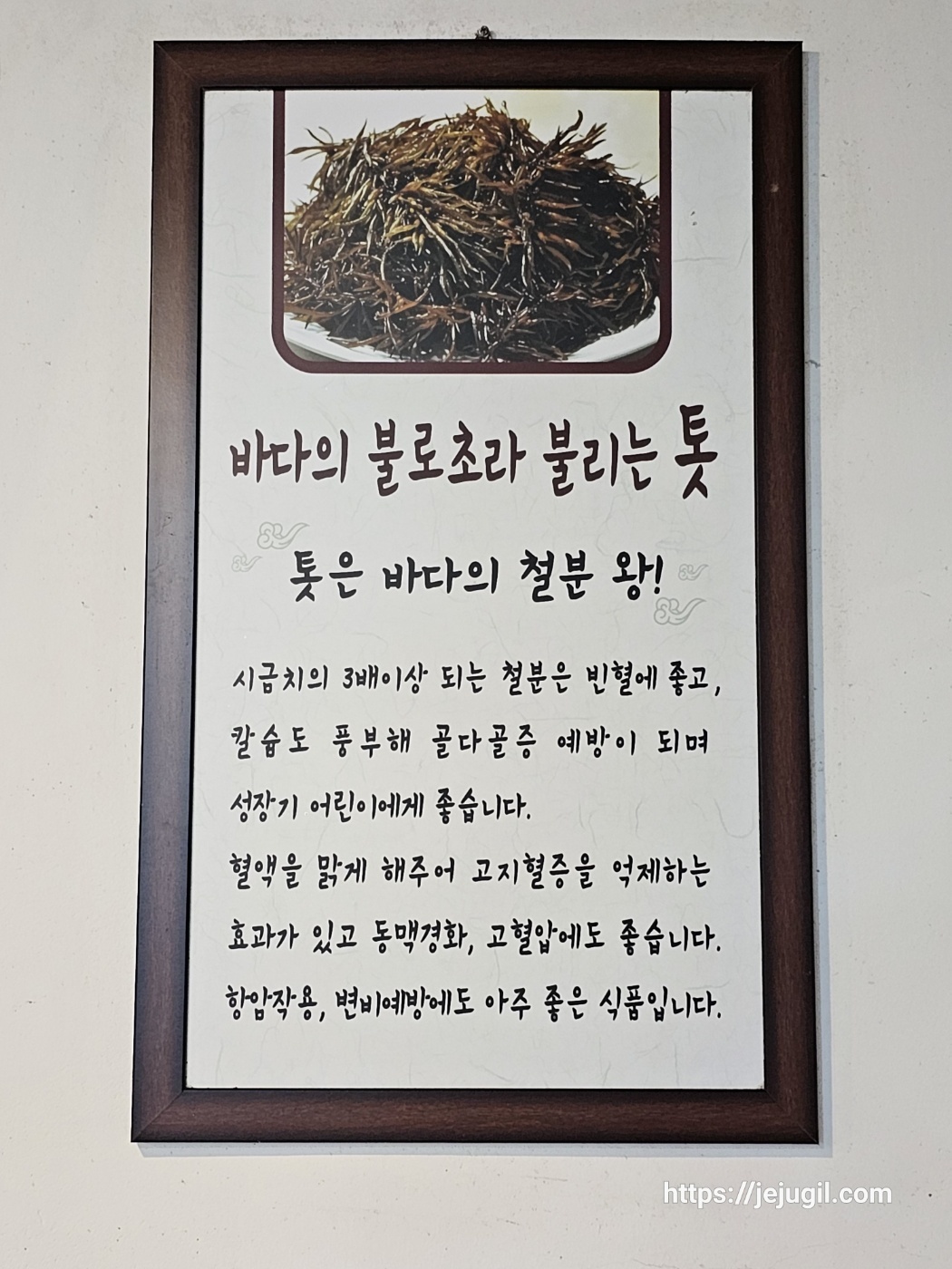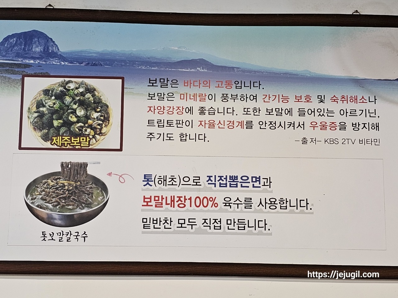 보말에 대한 내용이 벽면에 붙어 있어서 한 컷! 유독 우울증이라는 단어가 눈에 들어왔다. 거의 1년째 우울증과 씨름을 하고 있는 나로서는 그럴 수 밖에 없었다. 자율신경계를 안정시켜서 우울증을 방지한다는 말이 묘하게 위안을 주었다. 게다가 간기능 보호나 숙취해소에도 좋다고 하니 술 좋아하시는 분들이나 스트레스 받으시는 분들에게 딱 좋은 음식이겠구나 싶었다. 톳으로 면을 직접 뽑는 것도 신기했다.