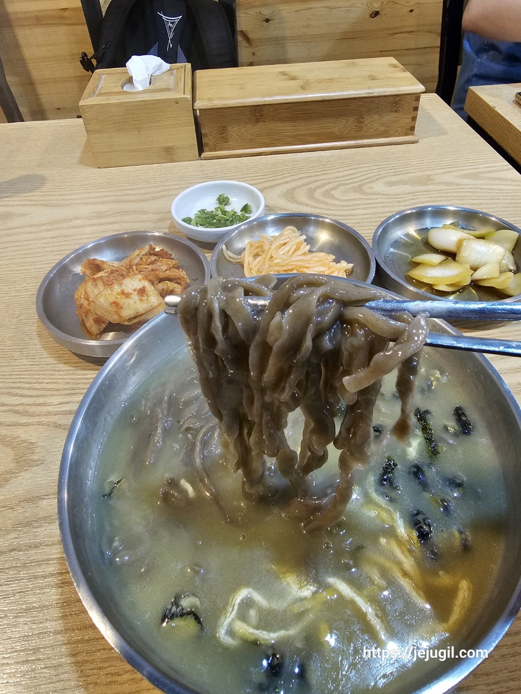 드디어 칼국수 도착! 꽤 국물양이 많았지만 보말 양도 적지 않았다. 탁자에 놓이자마자 식재료 본연의 향이 올라왔다. 보말내장으로 낸 육수와 톳으로 만든 면발이니 두말하면 잔소리다