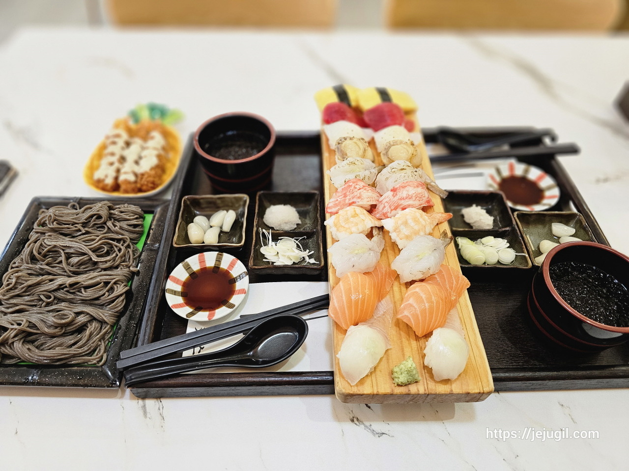 드디어 차려진 냉모밀 2인세트!! 추가로 딸려온 새우튀김도 먹음직스러워 보인다.