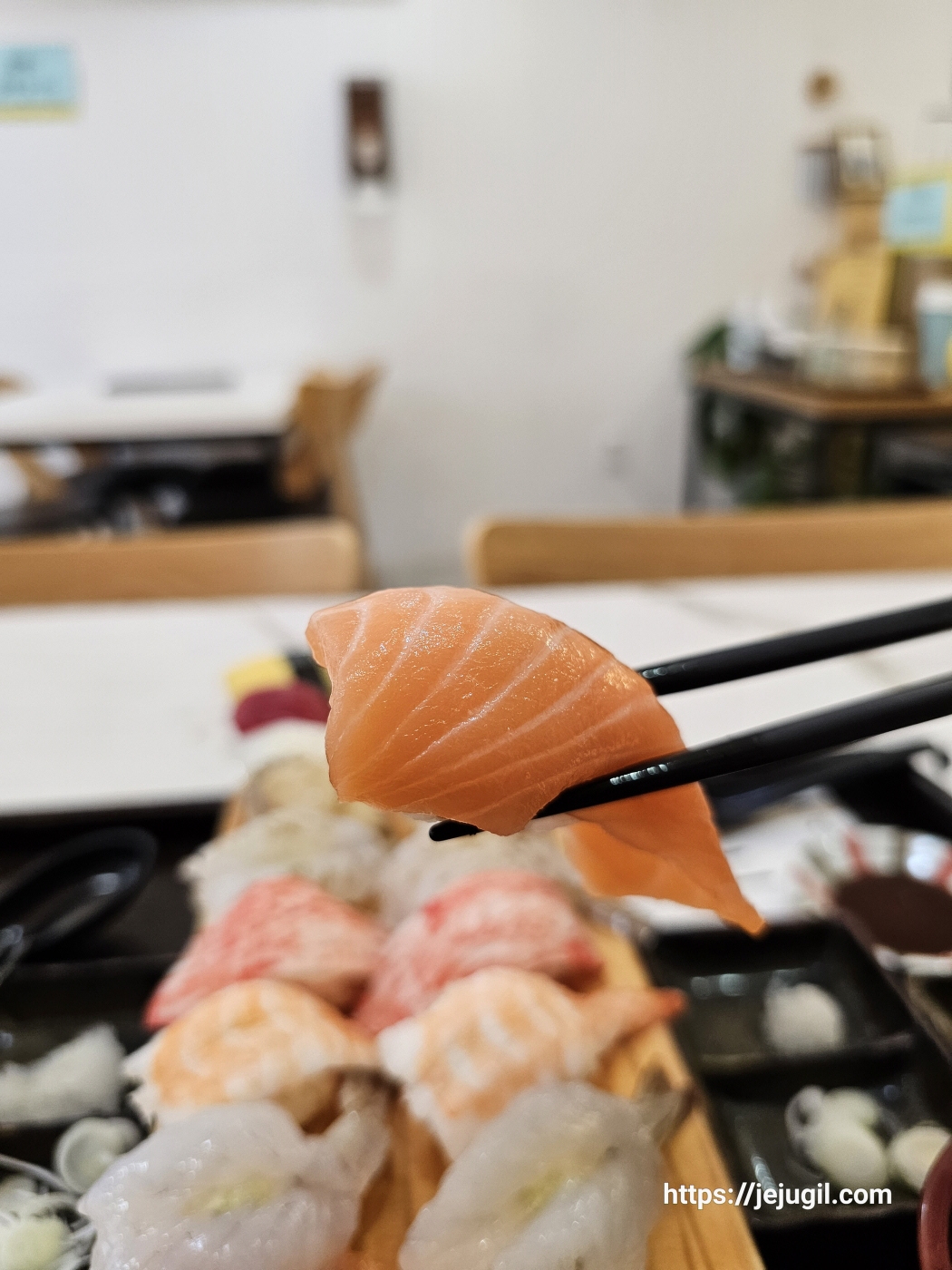 이렇게 봐도 맛있어 보이고 저렇게 봐도 맛있어 보인다. 특히 연어는 두툼해서 식감이 기가 막힌다. 거짓말 좀 보태서 넣자마자 입안에서 녹는다 녹아.