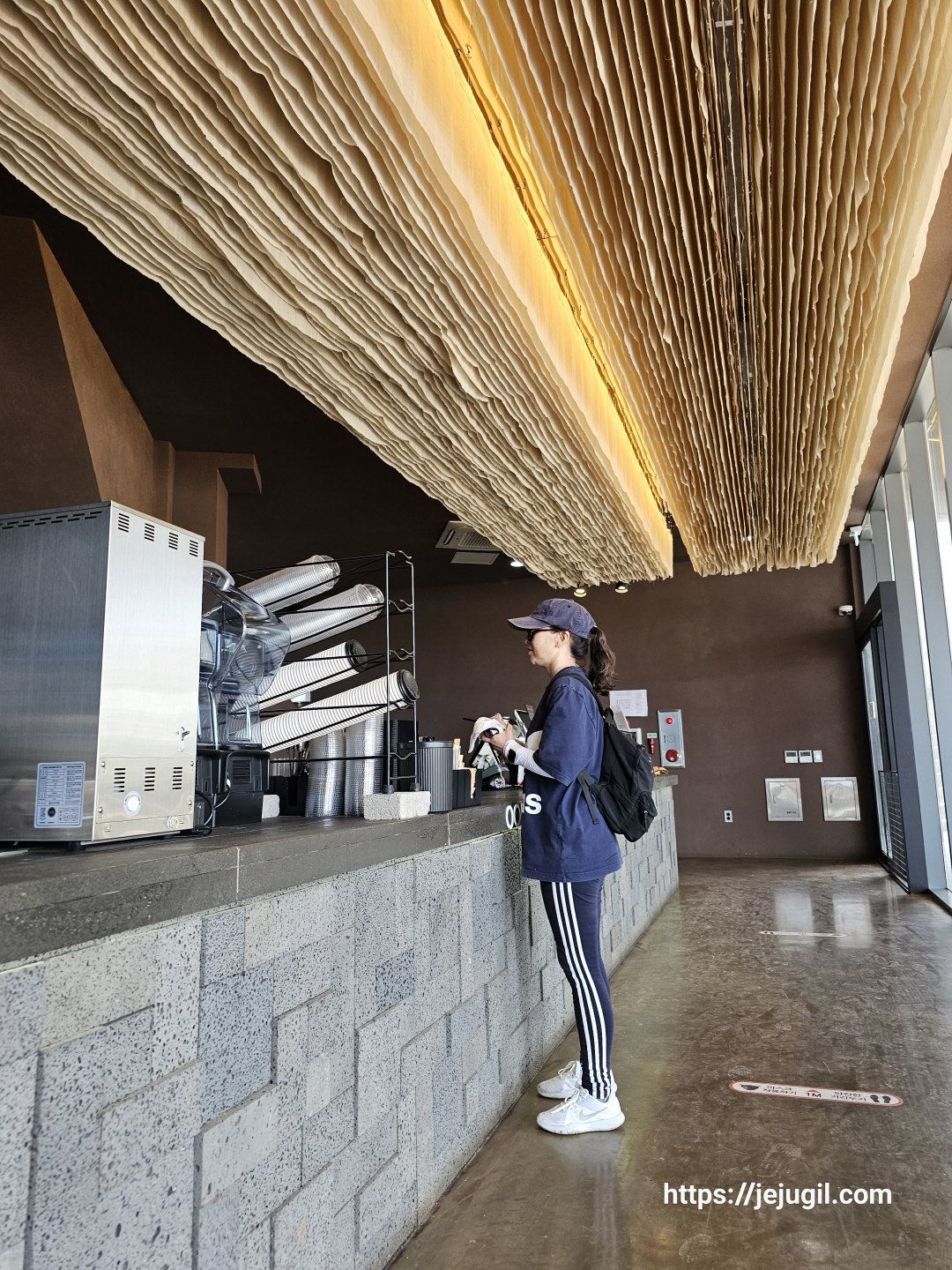 바다를 향한 전망 좋은 뷰에 벌써 꽤 많은 손님들이 차 있었다. 2층에도 1층과 마찬가지로 천정에 모시들이 겹겹이 매달려 있었다. 전망 좋은 앞자리를 포기하고 뒷자리로 물러나 스마트폰 충전도 하고 걷기에 지친 몸을 식혀본다. 앉은 자리가 얼핏보면 패브릭 소재같지만 모시였고 방석들도 전부 모시로 되어 있었다.