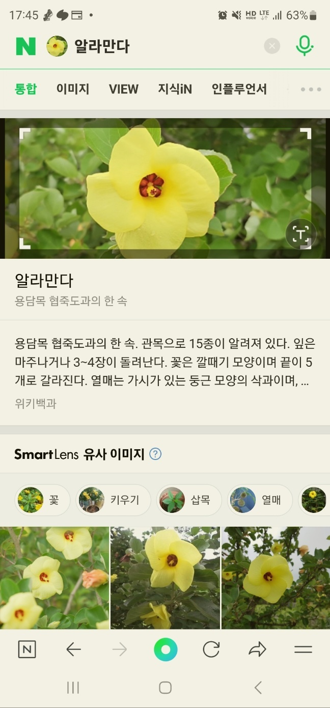 오오~ 역시 '네이버렌즈' 떡하니 찍은 꽃과 같은 여러 이미지와 함께 이름을 알려준다. 이름도 아름다운 '알라만다'......야~ 오늘 새로운 꽃 하나 알아냈다며 좋아하며 가던 길을 걸어갔다.하지만 그것도 잠시 멀리서 아저씨 한분이 우리를 향해 웃으시며 걸어 오신다. 그러고는 스스름없이 물어 오신다.