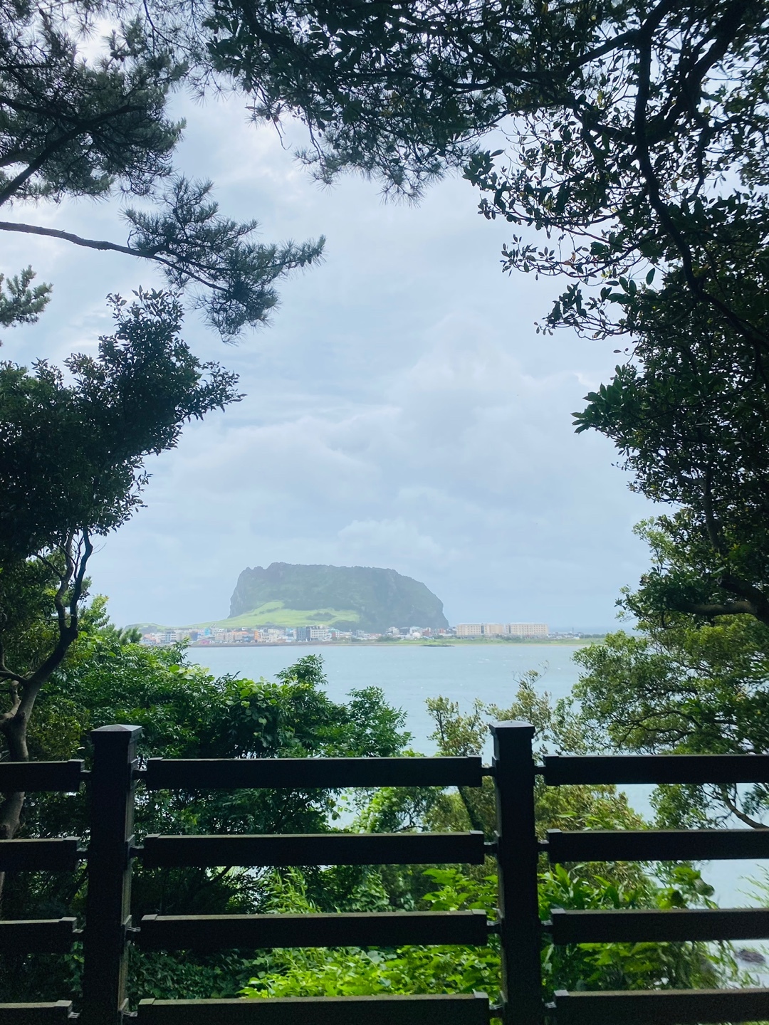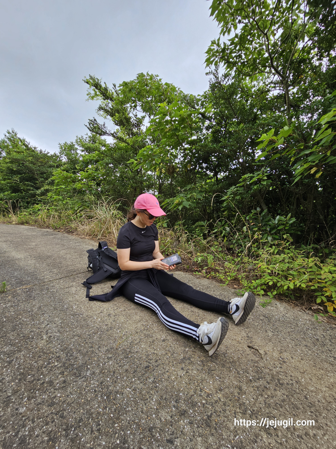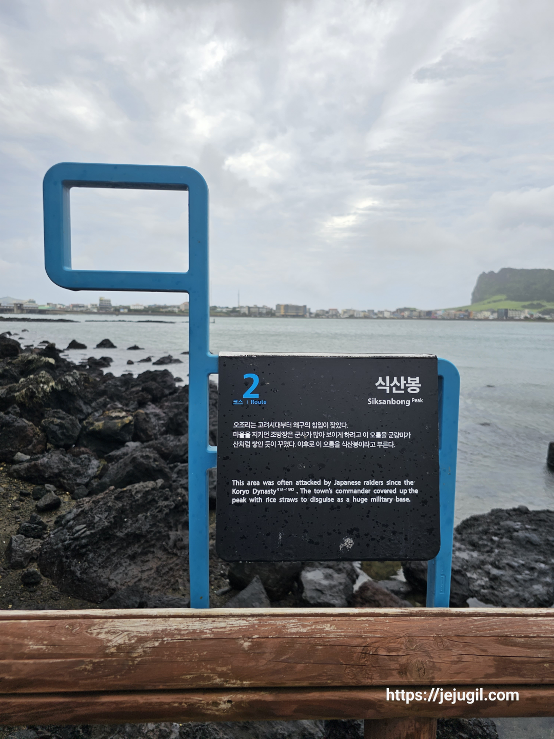 하지만 힘들기도 전에 식산봉 초엽에 멋진 사진스팟이 짠~ 하고 등장했다. 날씨가 좋았더라면 하는 아쉬움이 있지만 그래도 멀리 보이는 성산일출봉은 절경중의 절경이다.
