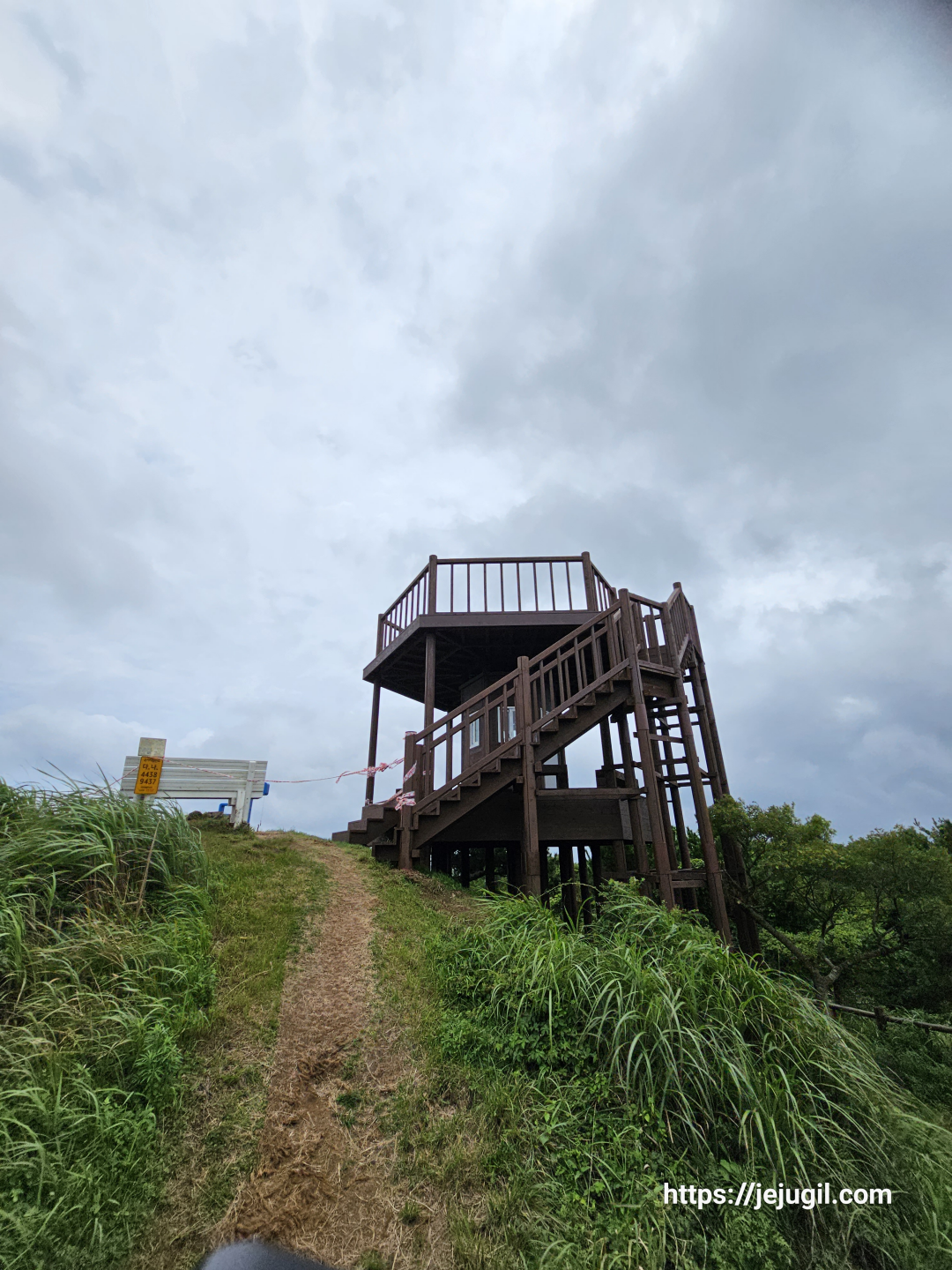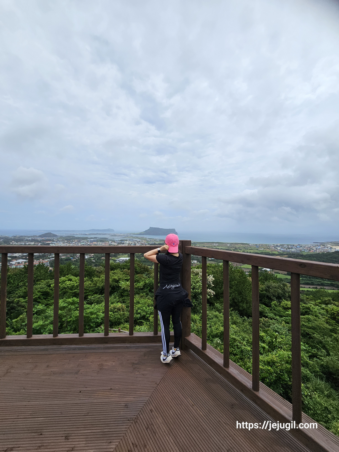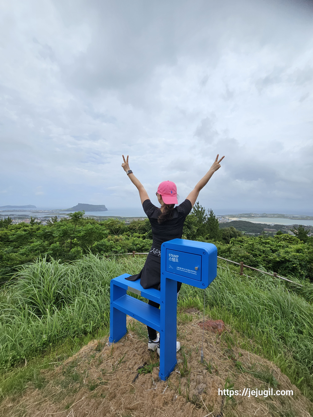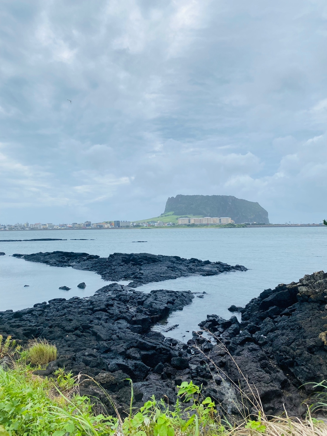 하지만 힘들기도 전에 식산봉 초엽에 멋진 사진스팟이 짠~ 하고 등장했다. 날씨가 좋았더라면 하는 아쉬움이 있지만 그래도 멀리 보이는 성산일출봉은 절경중의 절경이다.