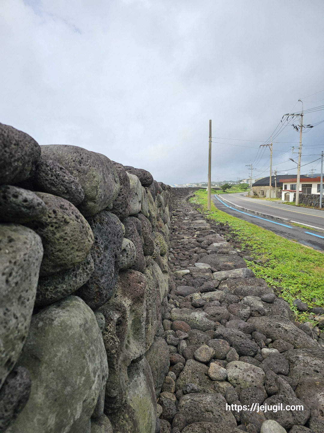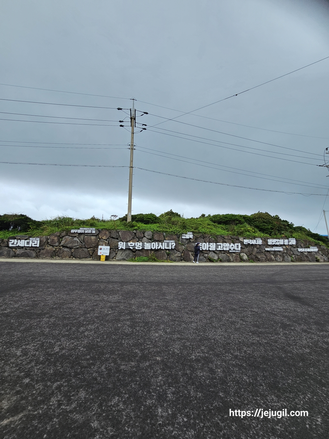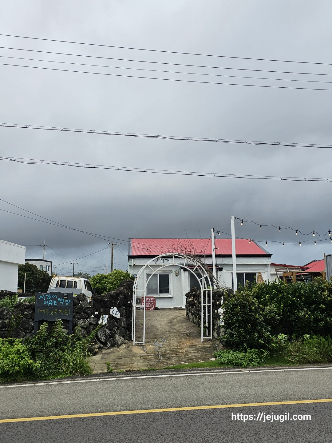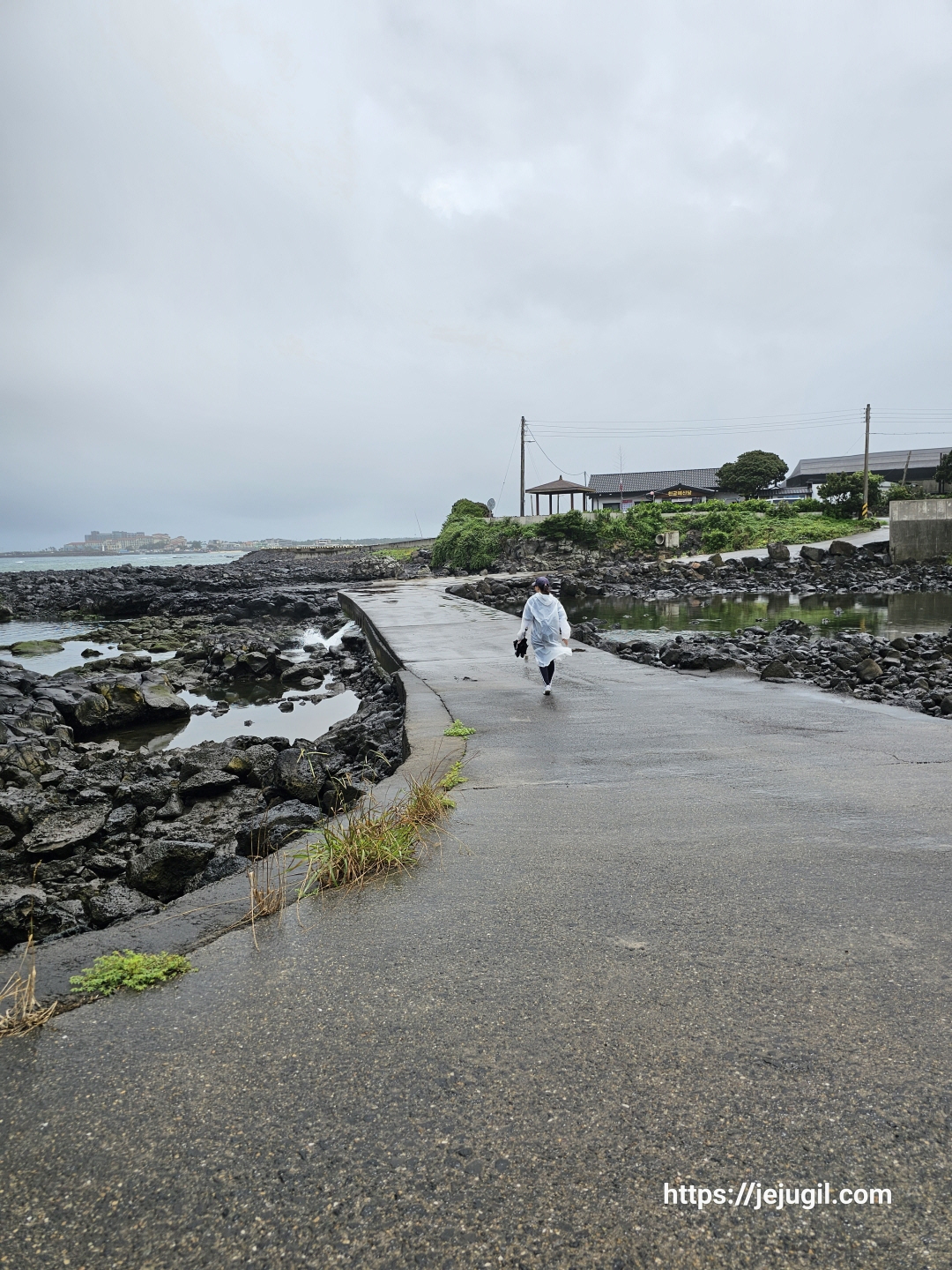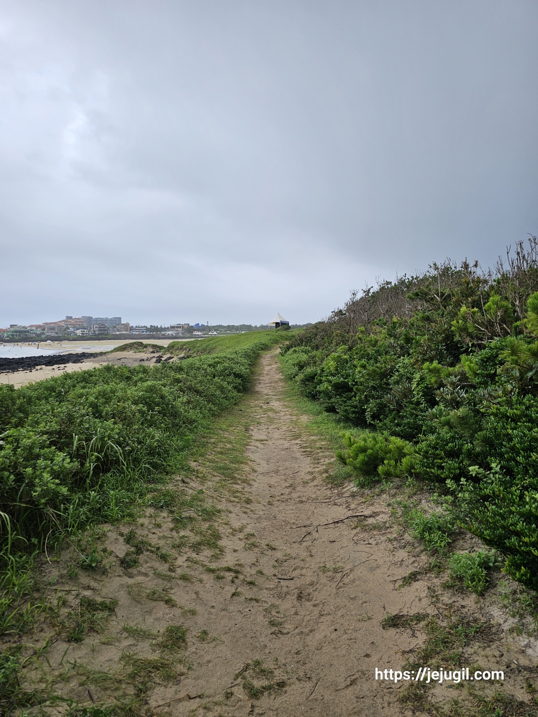 금새 그칠 비가 아니었다. 그래서 멀리보이는 정자로 급히 피신! 사진을 찍을 새도 없었다. 뭐 하지만 '여행은 길을 잃었을 때' 부터라고 하지 않는가? 긍정적인 마음으로 정자에 다다르자 마침 나이 지긋하신 동네 어르신도 비를 피하고 계셨다. 비를 피하면서 이 고장에 대한 이런 저런 이야기를 들을 수 있었다. 하지만 제주 방언을 쓰고 계셔서 반은 알아듣고 반은 짐작해서 들을 수 밖에 없었다. 비가 좀 잠잠해지고 우비를 꺼내 들었다. 마냥 쉬고만은 있을 수 없었다. 이곳에서 목적지인 표선해수욕장 종점간세까지는 대략 4~5킬로 정도밖에 남지 않은 곳이었기에 젖은 신발을 신고 가방을 메고는 다시 길을 나섰다.
