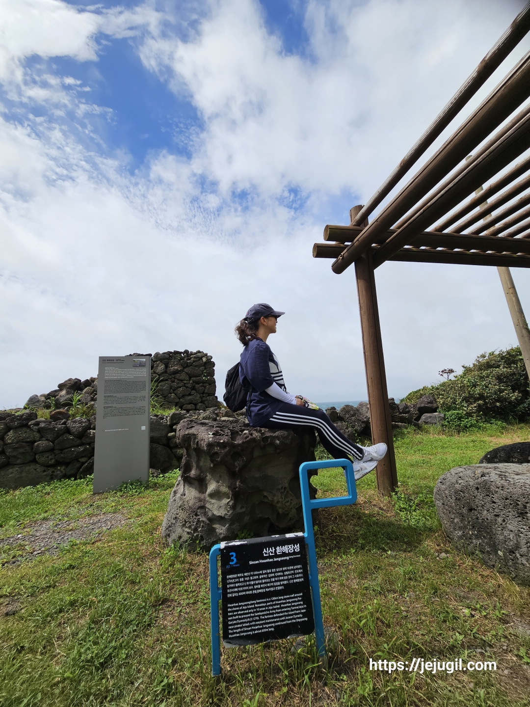 짧은 오솔길과 산길을 지나고 신산 환해장성간세와 마주쳤다. 신산환해장성의 전체 길이는 600미터 정도로 온평환해장성 제4지점과 연결되고 바닷가 자연석을 채취하여 축성했다고 한다.