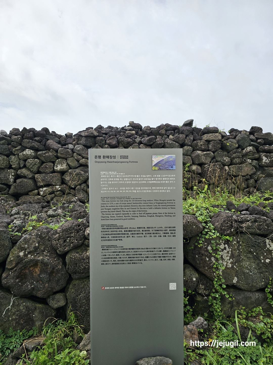 환해장성은 제주도 해안선을 따라 120킬로미터에 쌓아 올려진 석성을 말하는데 삼별초군이 몽고군을 방어하기 위해 만들어 진게 시초라고 하고 고려말까지 일본 왜구들을 방어하는데도 쓰였다고 한다. 지금은 온편, 곤홀, 별도, 삼양, 북촌, 동복, 행원, 한동, 애월 일대에 문화재로 지정되어 관리되어 있다.