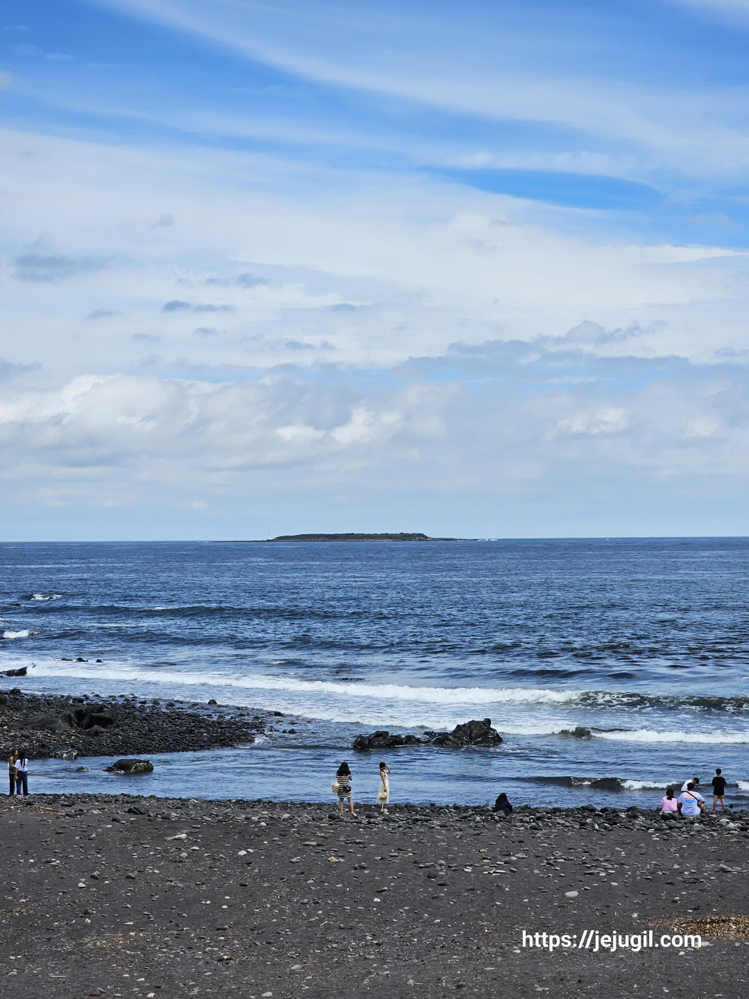 쇠소깍에서 나오면 바로 보이는 '하효 검은모래해변' 올레길6코스는 짧지만 초엽부터 즐길거리가 많아 오히려 시간이 더 걸릴 것 같기도 하다. 올레5코스에서 봤던 지귀도가 마치 광어처럼 넓다랗게 누워있다. 참 올레5코스 때도 이야기 한 적이 있지만 이 검은모래가신경통 및 관절염, 부인병, 피부미용 등에 효과가 있어 모래찜질을 하면 좋다고 한다.