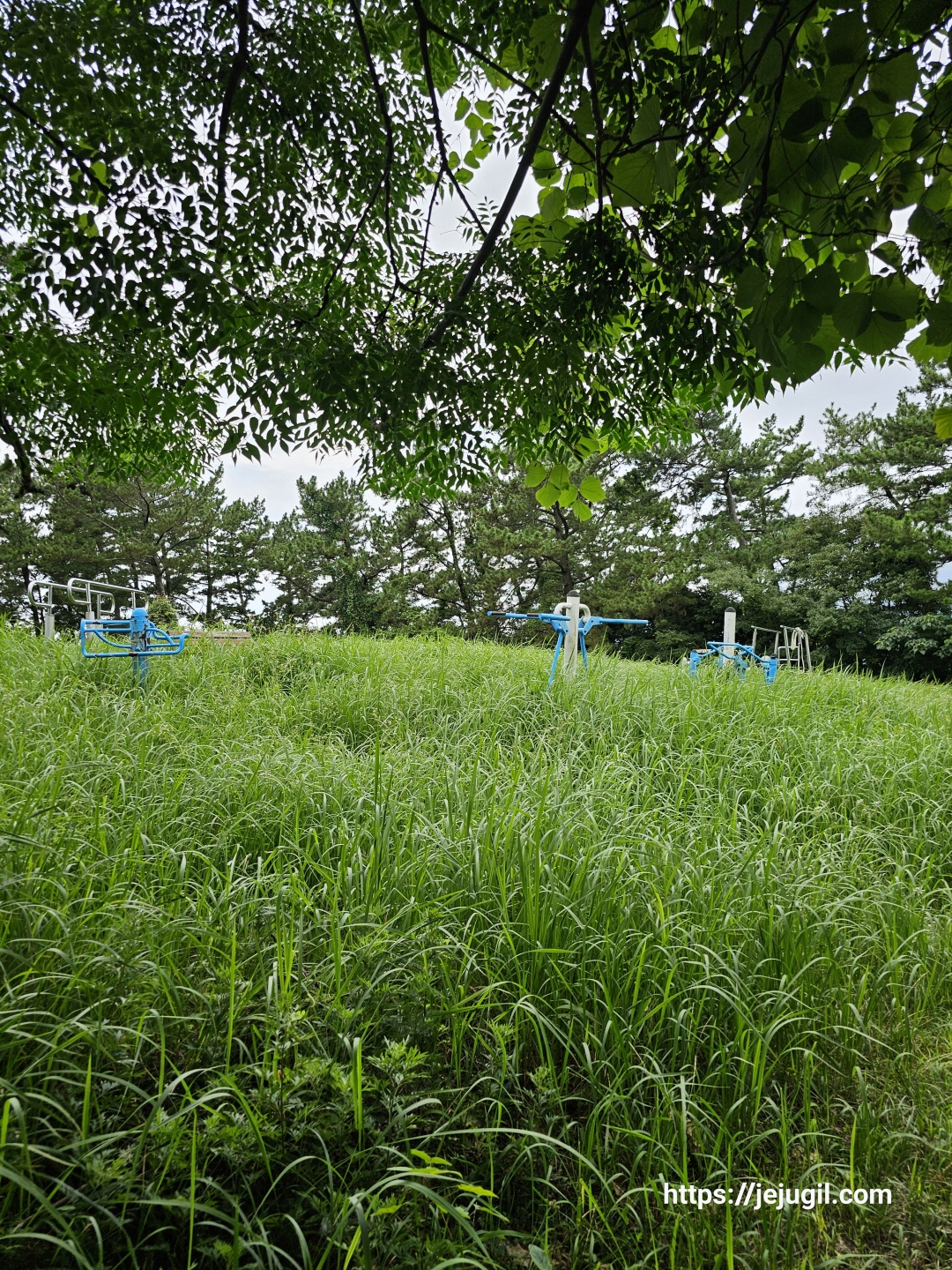 오름에 올라보니 풀들이 체육시설들을 잡아 먹고 있었다. 아우~ 힘들어~