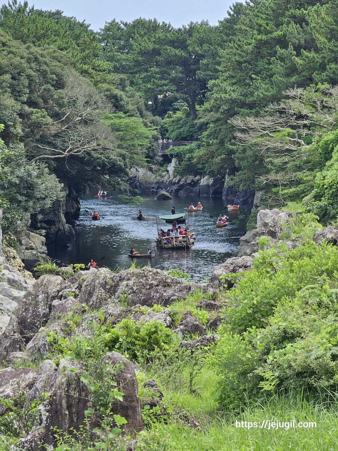 평일임에도 이미 많은 관광객들이 나룻배카약과 전통조각배를 즐기고 있었다. 누가봐도 아름다운 경관이다. 쇠소깍은 효돈의 옛말 지명인 쇠둔의 '쇠(소,牛)와 웅덩이를 뜻하는 '소(沼)', 그리고 강물이 바다로 흘러가는 지역인 하구를 뜻하는 '깍'에서 유래하였다. 전설에 따르면 이곳에 용이 산다고 하여 '용소'라고도 불렀는데, 가뭄에 이곳에서 기우제를 올리면 그 효과가 뛰어났다고 한다.