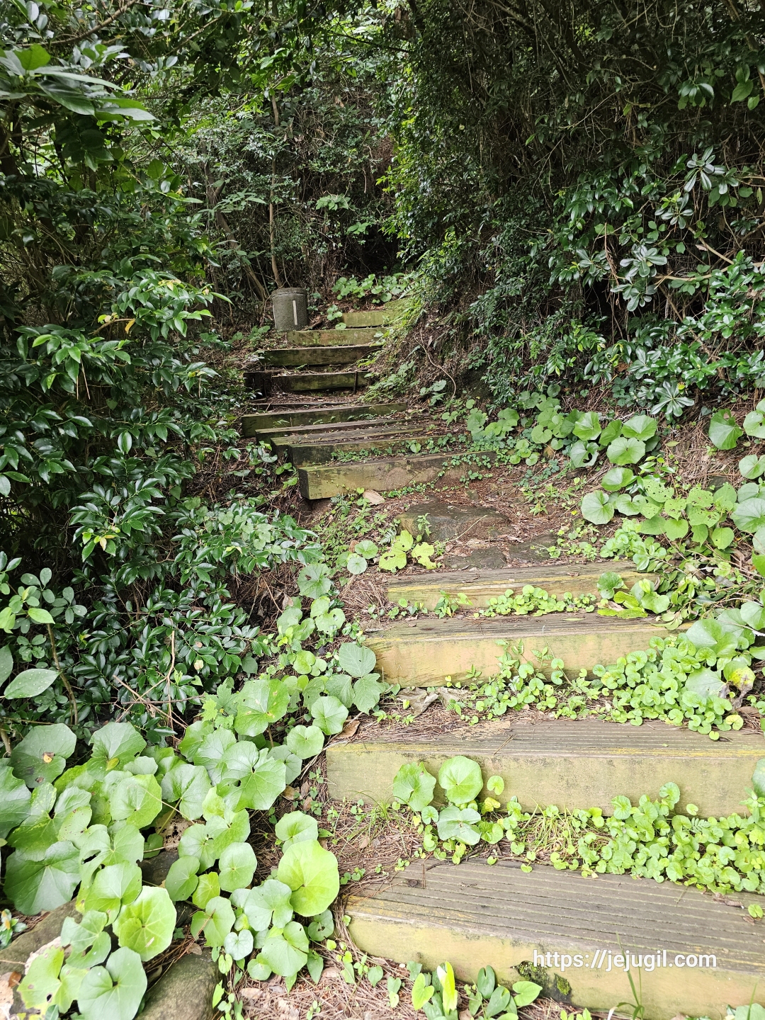 나무데크로 올라가야 하는 '제지기오름' 화면에는 바짝 말라 보이지만 실제로는 아직 물기가 있어 미끄러웠다. 올레길6코스도 꼭 트레킹화를 추천한다. 올라가는 길에는 대부분 손잡이가 없어서 미끌어지면 크게 다칠 수 있을 것 같았다.