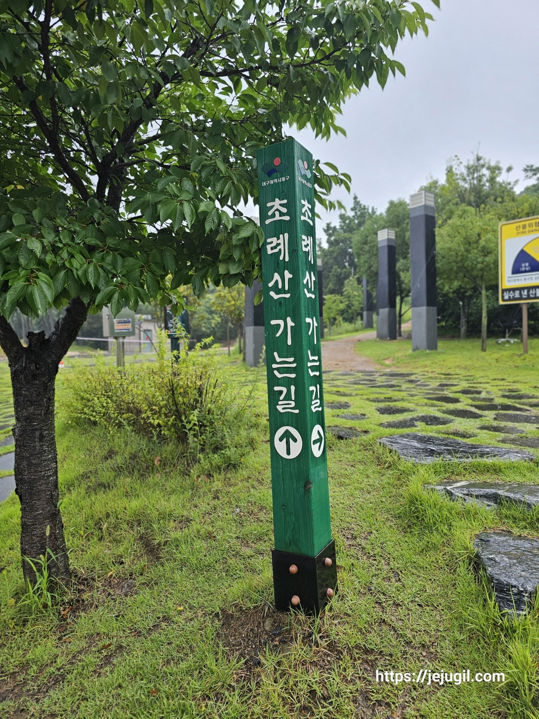 수스시에서 이노밸리로를 따라가다 보면 초례산 가는 길 표지판이 보인다. 비오는 날 등산은 위험할 거 같아 계속 이노밸리로를 따라 서쪽에 있는 율하천 산책로로 향했다. 율하천으로 가려면 조곡지, 신서지, 새론중학교, 노하지 등을 거쳐야 했다.